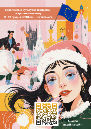 У рамках проєкту "Культурна та публічна дипломатія ЄС в Україні" обласна універсальна наукова бібліотека імені Д.І.Чижевського запрошує містян на різдвяний фестиваль «Європейські культурні резиденції у Кропивницькому», що відбудеться 9-19 грудня за підтримки Представництва Європейського Союзу в Україні.